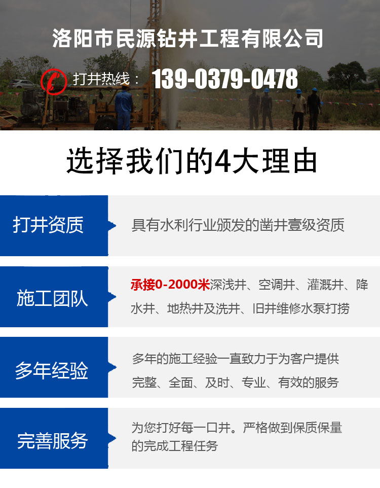 洛陽市民源鉆井工程有限公司是技術過硬、經驗豐富的施工團隊,具有鑿井行業壹級資質證書,擁有水鉆400、300鉆機、空壓機、打樁機、潛孔錘十余臺;適用于農家打井、農田打井、機關單位打井、企業廠家打井、以及各種工程工地打井。